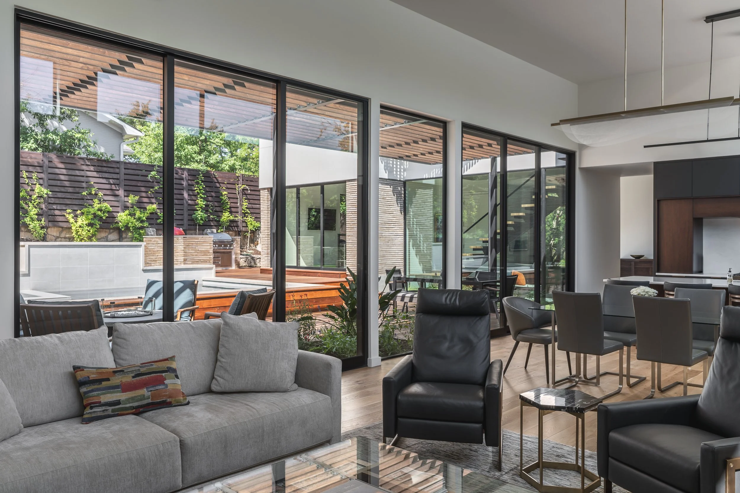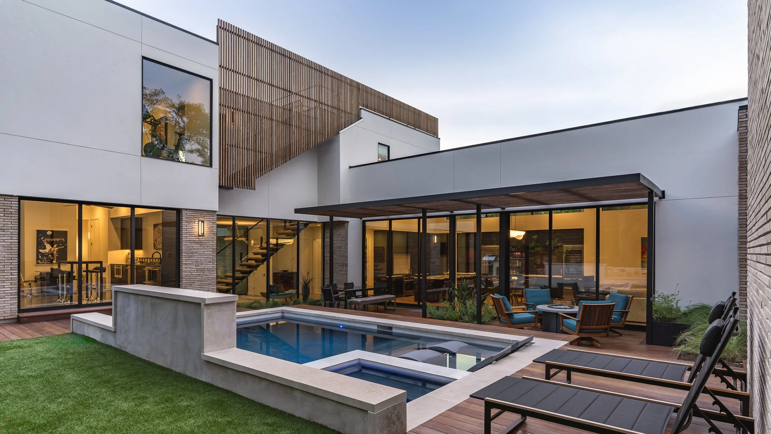One of the home's standout features was its rooftop deck, offering breathtaking panoramic views of downtown Austin, the perfect vantage point to watch the sunset. As I ascended the staircases to reach this elevated oasis, I was struck by the architectural brilliance of the design. The interior staircase itself was a masterpiece, surrounded entirely by glass panels that provided views of the pool. This design choice not only flooded the interior with natural light but also created a seamless connection between the indoor and outdoor spaces. The exterior staircase is beautifully integrated with the exterior millwork, providing a sense of anticipation on your ascent.